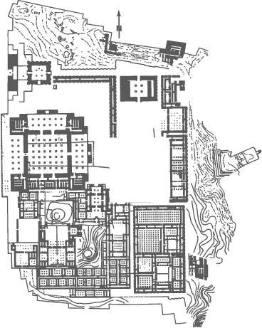 تالار اصلی این کاخ دارای هشت دروازه است که بر پهنه درگاههای شمالی آن (بطرف ایوان) مجلس بارعام، بر پهنه درگاههای جنوبی، اورنگ بران و بر پهنه درگاههای شرقی و غربی جنگ شاه با شير و يا حيوانات افسانهای حجاری شده است که تاكنون درگاههای جنوبی، شرقی و غربی آن مرمت و بازسازی شده است. طاقچه ها و دریچه ها از سنگ یکپارچه و دیوارها از خشت بوده است. در قسمت شمال کاخ ایوانی با ۱۶ ستون قرار داشته است. يك ستون تعمیر شده در داخل ایوان شمالی وضعیت اصلی ستونهای این کاخ را نشان میدهد دو مجسمه عظيم گاو نگهبان در دو طرف ایوان آنرا تزئین میکرده است.